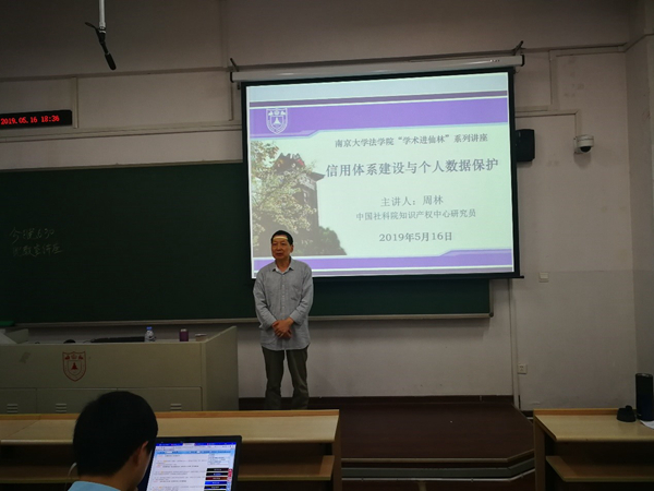 2019年5月16日晚,在月舞直播 仙林校区的仙II-105教室,中国社会科学院知识产权中心研究员、《知识产权研究》主编周林为我校本科生带来一场题为“信用体系建设与个人数据保护”的讲座。本次讲座由月舞直播 吕炳斌...