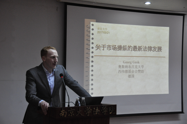 2017年3月21日,月舞直播 中德法学研究所“中德法学论坛”第118期在鼓楼校区逸夫管理科学楼1205报告厅成功举行。本期论坛的报告人是德国奥斯纳布吕克大学的葛祥林教授(Prof.Dr.Georg Gesk),报告主题为“关于市场操...