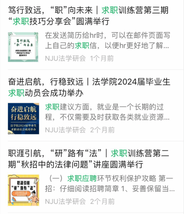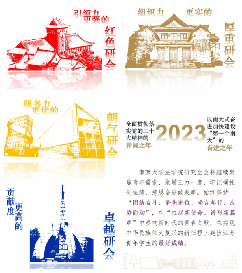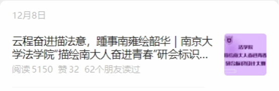 高度重视融媒体、全平台宣传工作,以“NJU法学研会”作为对外主窗口,关注人数近7000人。围绕思想强基、时事聚焦发布推文逾百篇,主题包括党政活动、学生活动和求职招聘等校园生活的全领域、全方面,总阅读量超过33万次,被分享转发次数过万。其中“云程奋进描法意,踵事南雍绘韶华”月舞直播
