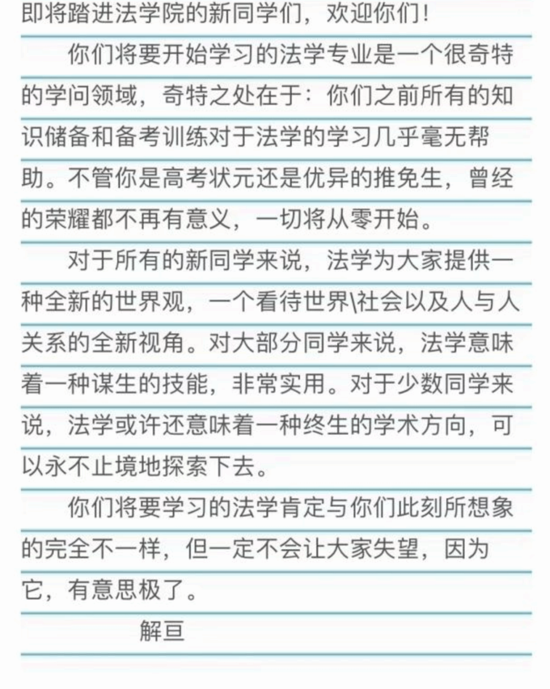“你们将要开始学习的法学专业是一个很奇特的学问领域,奇特之处在于:你们之前所有的知识储备和备考训练对于法学的学习几乎毫无帮助。对于所有的新同学来说,法学为大家提供一种全新的世界观,一个看待世界、看社会以及人与人关系的全新视角。对大部分同学来说,法学意味着一种谋生的技能,非常实用。对于少数同学来说,法学或许还意味着一种终生的学术方向,可以永不止境地探索下去。”