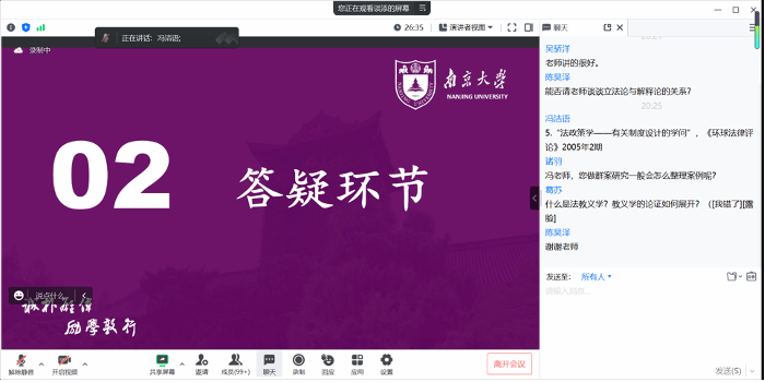 通过冯老师充盈详实的分享,同学们收获颇丰。在答疑环节,大家纷纷就老师的分享内容和自身疑惑提出问题,从民法基础问题到文献搜集整合,再到硕士论文的写作困惑,冯老师一一进行了针对性的回复,为大家带来了更为深入的研究写作指导。