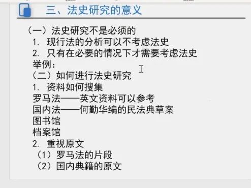冯老师从法史研究的必要性和如何进行法史研究两个方面进行了深入阐述。冯老师提醒大家法史研究不是必须的,现行法的分析可以不专门考虑法史,但在必要的情况下需要进行法史研究,比如研究罗马法可以参考英文版《罗马法》,而研究国内法应当关注《民法典》,并希望大家关注条文体系位置变迁背后的立法目的。