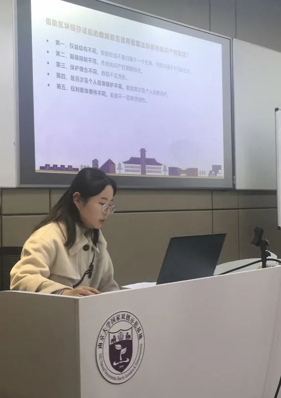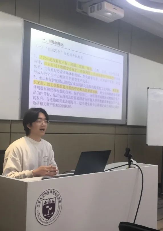 邱道鸣同学在汇报中对“数据知识产权”的概念进行了解释和检讨。首先根据各地方登记规范对登记客体的定义,分析出数据知识产权客体的规范结构。在此基础上分析比较法上数据与知识产权的历史联结,以及数据知识产权在现行法中的地位。最后对数据知识产权的体系进行反思,总结了数据与知识产权的理念关联,并对数据知识产权的“知识产权性”进行了检讨与追问,例如怎样处理好专有权和数据流通之间的关系。