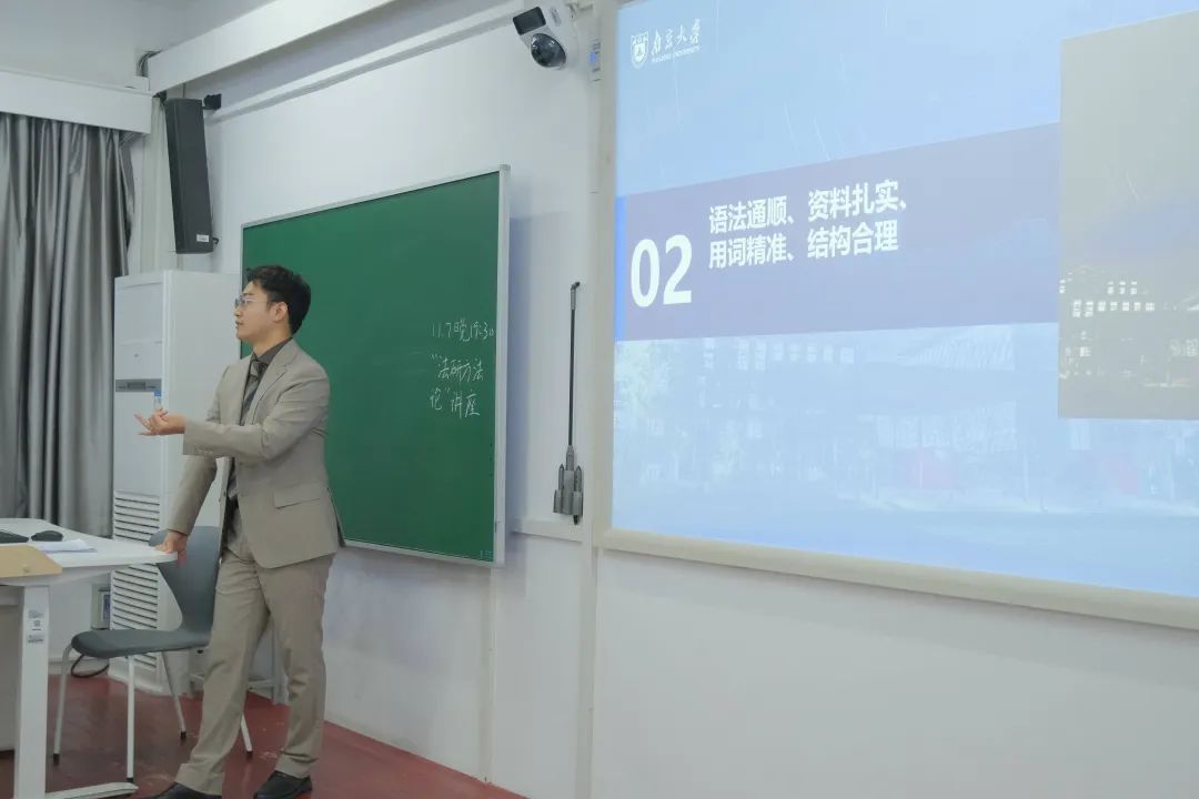 赵老师强调,警惕用语通顺是写文章的基本前提;资料扎实是文章写作的研究基础;用词精准是论文严谨性、科学性的体现;结构合理是文章论述充分的关键。其中,结构合理是四个要求中最难做到的。针对这一问题,赵老师演示了“三个问题”、“几个模式”、“特征-成因-反思-突破”“旧论新论和展开”等四个技巧,教好我们如何写出一篇好文章。