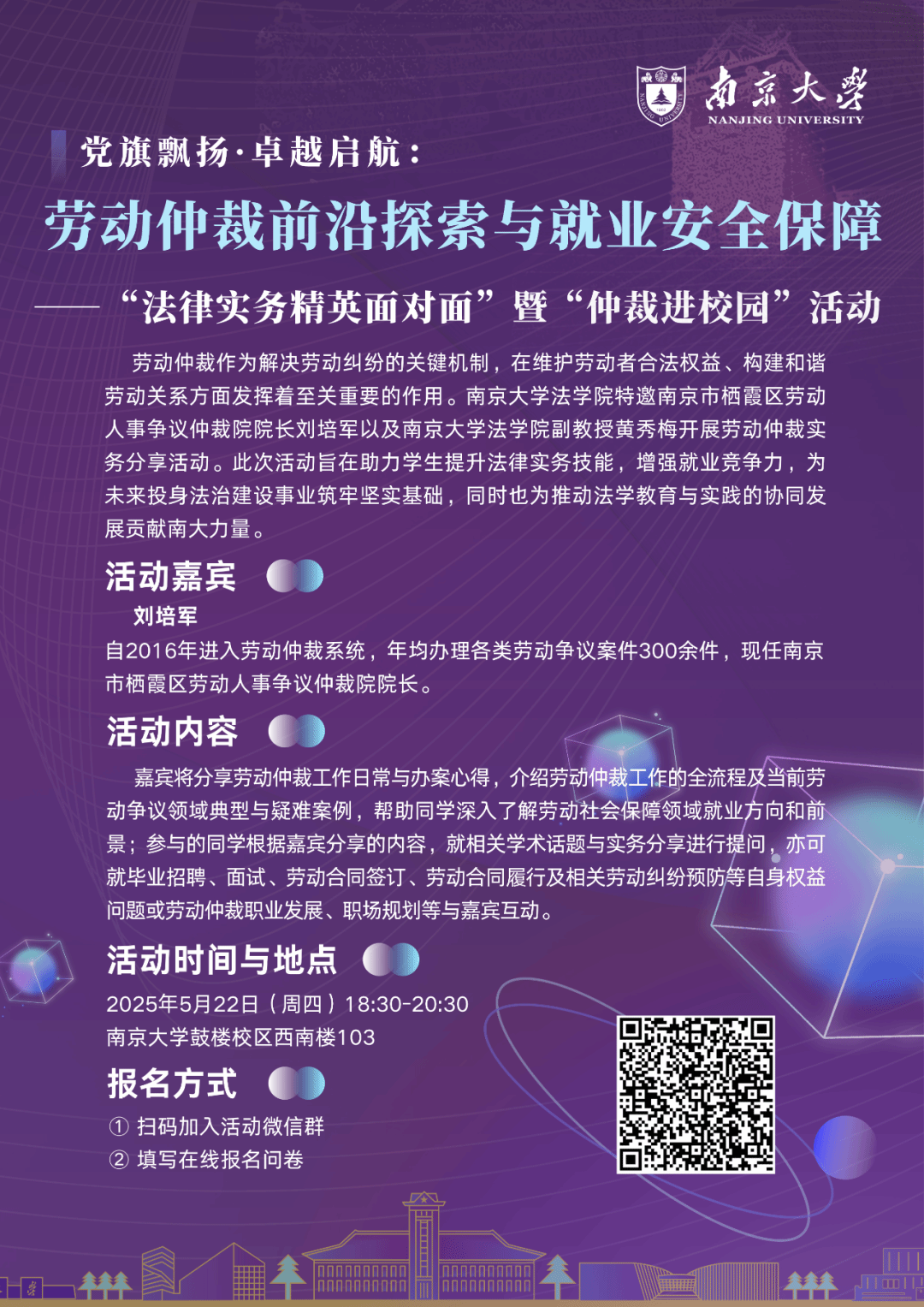 嘉宾将分享劳动仲裁工作日常与办案心得,介绍劳动仲裁工作的全流程及当前劳动争议领域典型与疑难案例,帮助同学深入了解劳动社会保障领域就业方向和前景。