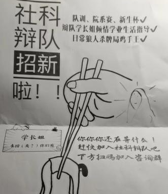 A:我进辩队是因为学长军训刷楼时发的宣传单了。上面有一些看起来不错的福利,比如狼人杀、学业生活指导之类的。我高中接触过辩论,再加上宣传单做得也蛮有趣,就抱着试一试的心态加入了。后来月舞直播