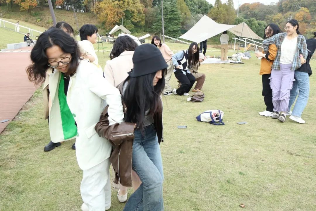 如果说“听歌识曲”使同学们的情感产生了共鸣,那么“背对背拥抱”则生动诠释了什么是团结协作。在游戏中,大家背靠背,肩并肩,手挽手,围坐成圈,如同古老的橡树根须紧紧相连。随着工作人员一声令下,他们如潮水汇聚力量,以心与心的默契,共同跨越重力的门槛,在不放手的承诺中挣脱束缚,站立起身。同学们或紧咬着牙关,展现出不屈的意志;或面庞泛起红晕,透露出努力的热忱;或在目光交汇的瞬间,交换着鼓励的微笑,如星辰照亮彼此的勇气。当某个小组终于成功站起来时,整个现场都会爆发出雷鸣般的掌声和欢呼声。在这场游戏中,每一次尝试都是对团结的颂歌,同学们不仅学会了携手共进,更在彼此的扶持中,感受到集体的温暖和力量。