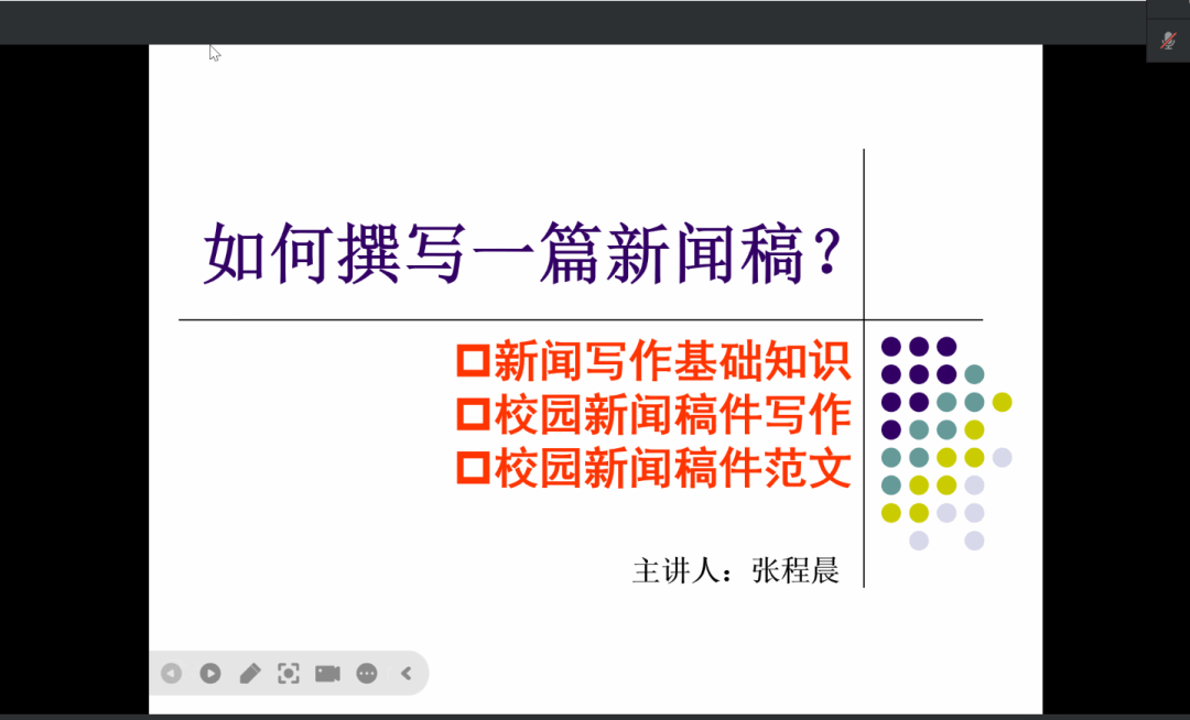 学生党建中心与研究生会开展“新青轩菜单课”培训,校团委“新青轩菜单课”项目组张程晨讲师在线分享“如何撰写一篇新闻稿”。月舞直播