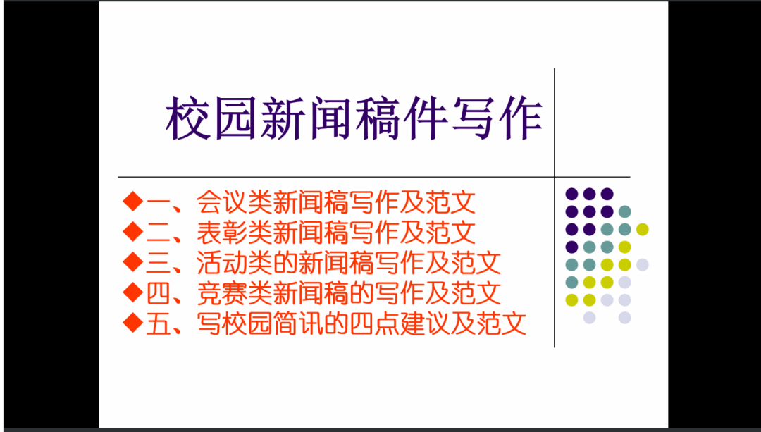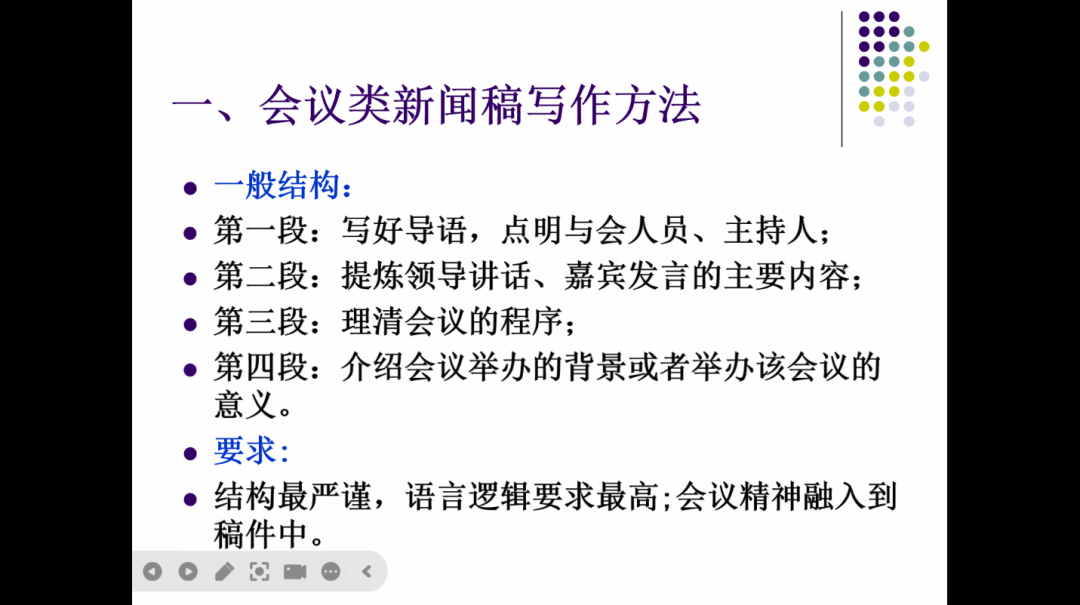 以无招胜有招,分析新闻稿的类型与范文,让我们从下笔千言到妙笔生花。针对纷繁复杂的写作需求,张程晨根据不同场合进行分类,凝练出五大类型新闻稿的写作要点,并在范文中予以讲解。会议类新闻稿是所有类型中最为严谨的,还是其他类型文稿的源头活水。表彰类新闻稿需要给表彰对象“扬优势”,为新闻受众“树榜样”。活动类与竞赛类新闻稿应保证行文逻辑与活动流程之间是一币两面的关系。校园简讯重在一个“简”字,简短不简单。