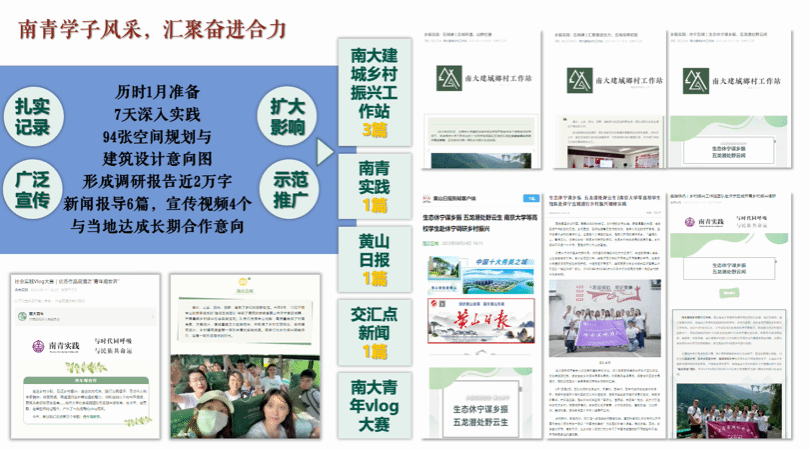 黄山休宁“踏云五城”社会实践团队负责人谈佳璇同学从项目背景及需求、整体策划方案、运营模式设计三个方面对项目进行了详细介绍。“踏云五城”团队历时1月准备、7天深入实践,取得了空间设计、旅游规划、宣传宣讲方面的分设成果,形成调研报告近2万字,并与当地达成长期合作意向,为河谷地区在经济、社会和环境方面的可持续发展作出了南大学子的积极贡献。此外,谈佳璇同学还鼓励大家以实际行动落实“奋进行动”,用我们的所学所长为祖国建设出力。