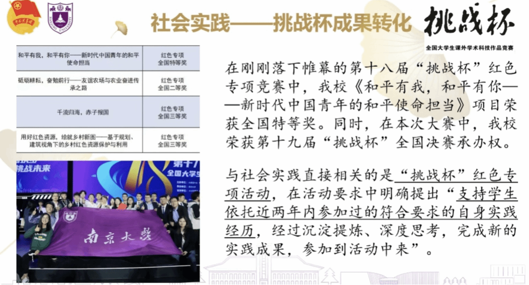 “全周期的实践育人工作,推动高质量实践成果不断涌现”,聂稼轩同学结合我校在第十八届“挑战杯”红色专项竞赛中取得的优异成果和将于2025年承办第十九届“挑战杯”全国决赛的情况,鼓励同学们依托社会实践经历开展成果转化,参与到挑战杯赛事中。