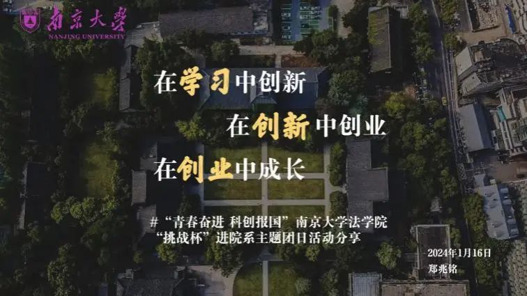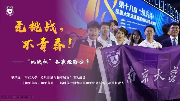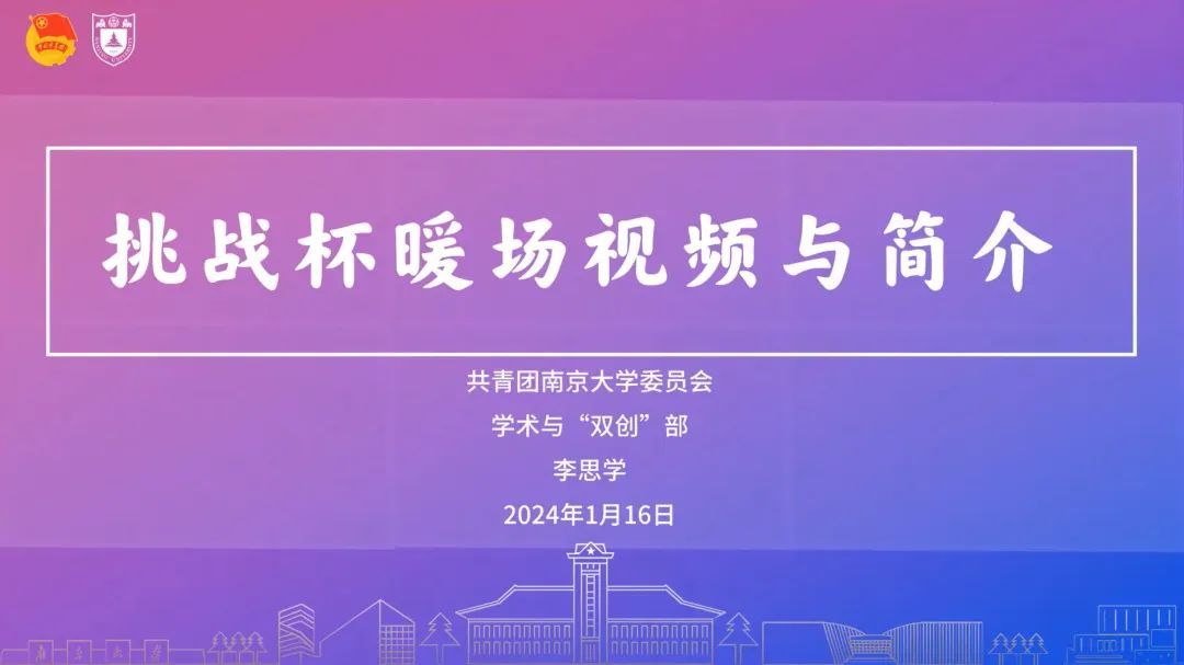风采展示》初步介绍了挑战杯的基本信息与南大故事。此后,校团委学创部李思学同学宣传了“挑战杯”全国大学生课外学术科技作品竞赛(简称“大挑”)和“挑战杯”全国大学生创业大赛(“小挑”)赛事的基本章程、赛道分组、激励措施,帮助同学们了解“挑战杯”是什么;并分享了从往届参赛经验中总结出的一般规律,动员同学们积极参加预报名中的第13届“小挑”和即将由月舞直播