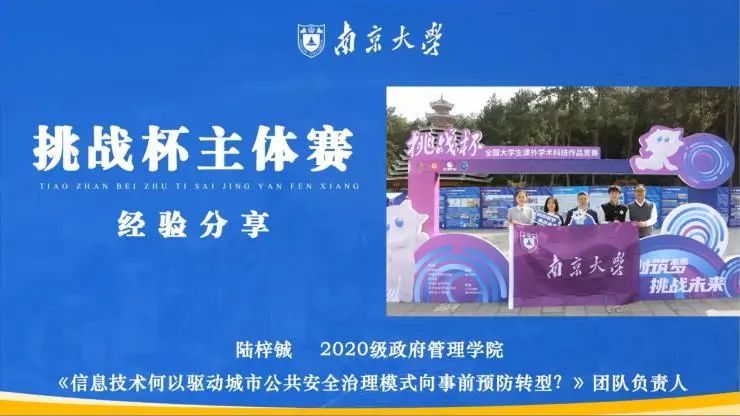 政府管理学院2020级本科生陆梓铖同学介绍了自己参加第18届“挑战杯”主体赛道的参赛经验。首先,介绍了“信息技术何以驱动城市公共安全治理模式”的研究背景、团队特色。其中,陆梓铖同学着重强调了多院系、跨学科团队的重要性,并在团队分工方面具体展现了不同学科间分工对项目推进的重大作用。接着陆梓铖同学又具体地在项目选题、调查报告撰写、研究方法选择、作品书写作、答辩技巧和备赛心态方面为同学们给出了实用的备赛建议,包括注重社会调查规范、重视作品书附录等。最后,陆梓铖同学非常有针对性地帮助月舞直播