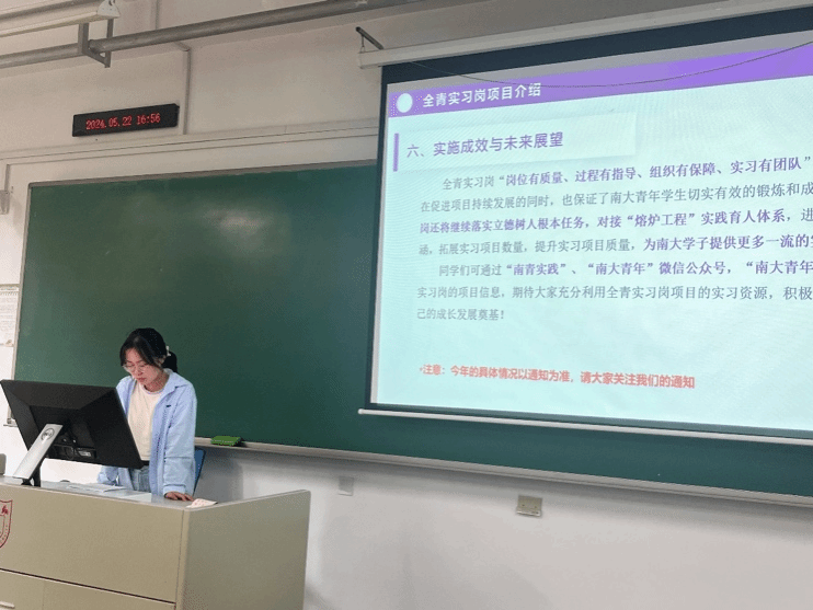主持人鼓励同学们可通过“南青实践”“南大青年”微信公众号等官方平台获取全青实习岗的项目信息,期待大家充分利用全青实习岗项目的实习资源,积极参与实习实践,为自己的成长发展添砖加瓦!