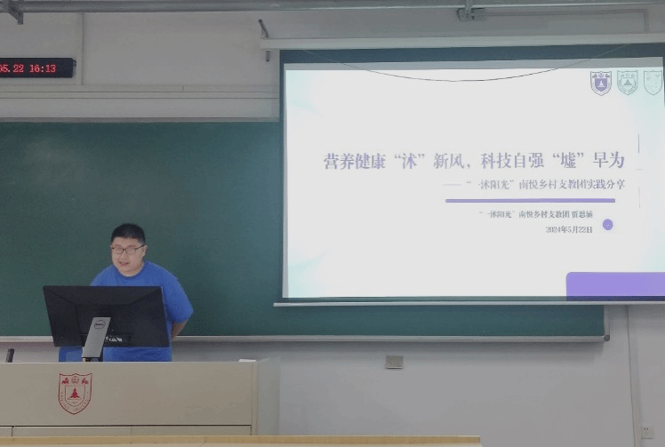 接下来,贾思涵同学为以“营养健康‘沭’新风,科技自强‘墟’早为”为题,向同学们分享了他在江苏省宿迁市沭阳县高墟镇高墟中心小学的支教和实践经历,并用视频的方式讲述了他与支教伙伴及当地小朋友们相处的温馨瞬间。贾思涵同学着重强调了开展有内涵、有深度的项目调研的重要性,并指出“一次出色的社会实践可以持续发展下去”。他提到,深入参与一次社会实践,未来还可以衍生出更多的发展机会,比如申报挑战杯、大学生创新创业竞赛项目、参与基础学科论坛,或是加入志愿服务方面的高规格赛事。