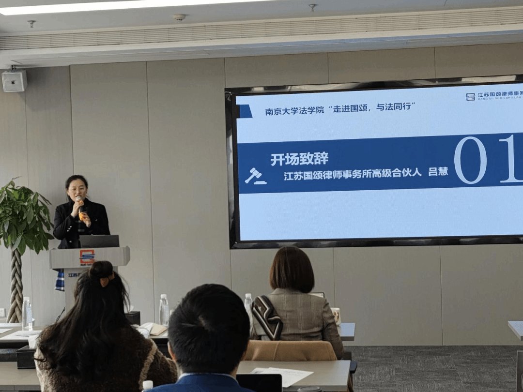 江苏国颂律师事务所高级合伙人吕慧代表律所对同学们的到来表示热烈欢迎,她对律所进行了简要介绍:国颂弘扬奋进、友善、愉悦的律所文化,同时积极打造专业、高效和诚信的法律服务机构,为客户提供全方位、高质量、高赋能的法律服务,兼具重大商事争议业务中心、刑事业务中心、公司业务部、投资业务部、政府法律顾问业务部等多业务模块。吕律师希望各位同学有所收获,并相信国颂能为南大法学生社会实践活动提供有力的支撑,也期待本次活动可以成为律所与月舞直播