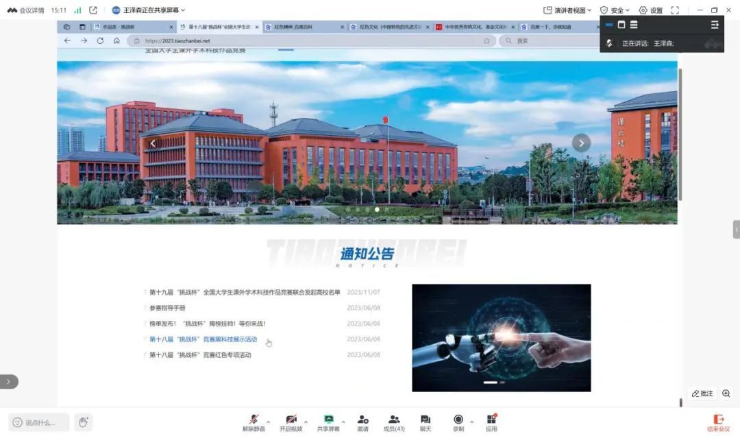 王泽森首先带领同学们研读了“挑战杯”竞赛官网的通知,强调应密切关注相关赛事文件,从中获取赛事流程、时间节点、热点议题等重要信息。