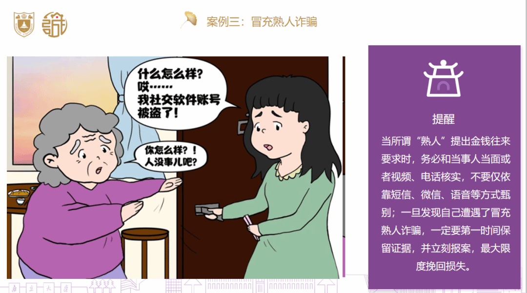 最后,结合相关案例,志愿者为大家讲解了遇到相似情形、接到类似电话时的应对方法:首先,不轻信来电者的身份和说辞、通过可靠渠道确认电话内容真实性;其次,一旦意识到自己可能受到诈骗,立即向当地公安机关报案并提供详细情况和相关证据;再次,切勿继续与诈骗分子进行联系或支付任何费用;最后,配合警方的调查工作。此外,志愿者还提醒大家切勿轻易泄露个人信息、尽量避免点击不明来源的链接、警惕社交工程攻击以及遇到可疑情况应当立即报警。