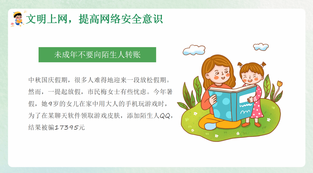 随后,志愿者带领同学们将话题转向互联网。先通过一个小测试,让同学们初步认识到文明上网应当怎么做。之后,为了提高同学们的警惕心,志愿者针对酿成悲剧的反面案例进行了形象的讲解,还向同学们详细介绍文明上网的注意事项:提高网络安全意识、不沉迷于网络、不浏览不良信息。最后,志愿者还向同学们介绍了“文明上网”挑战计划书,号召同学们积极参与“绿书签行动”,鼓励同学们付诸行动。