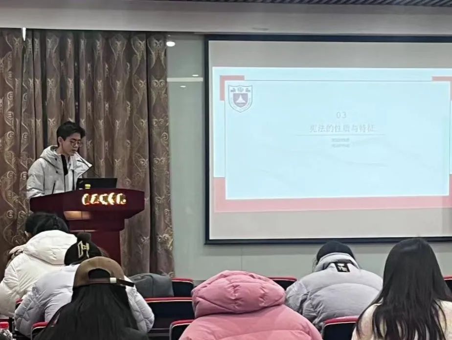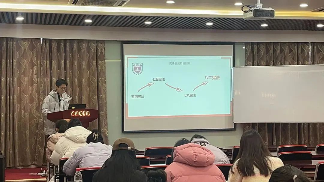 接下来,志愿者详尽讲解了中华人民共和国成立以来宪法的发展历史,在场的同学们都全神贯注地听讲,与主讲人互动,共同探索着宪法的知识世界。