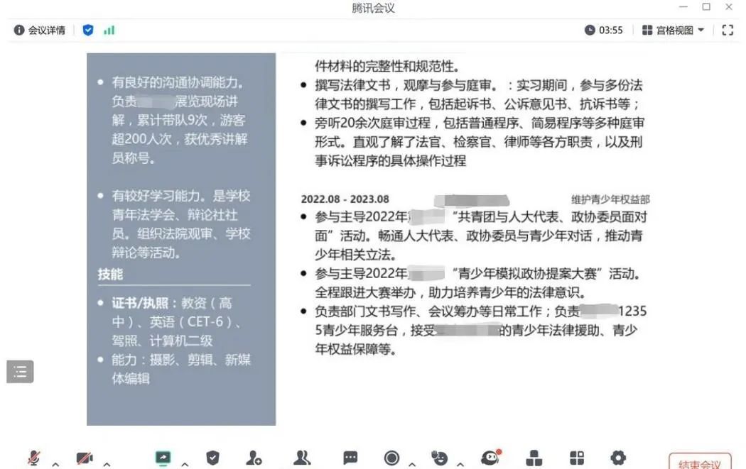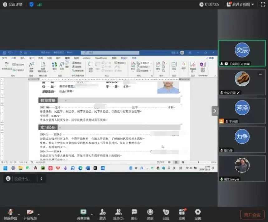 第一场常态化一对一指导于2024年11月12日通过腾讯会议线上举行,活动邀请到祝琳玥律师作为嘉宾,共对6名同学进行了辅导。祝琳玥律师根据每位同学的实际情况,量身定制个性化的建议。