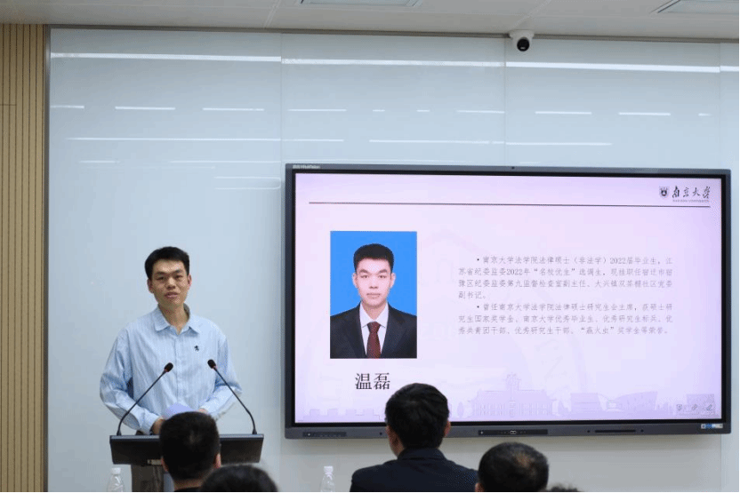 法律硕士(非法学)2022届毕业生,江苏省纪委监委2022年“名校优生”选调生,现挂职任宿迁市宿豫区纪委监委第九监督检查室副主任、大兴镇双茶棚社区党委副书记的温磊师兄分享了自己作为一名选调生,从学校到机关、从机关到基层的工作经历。通过分享自己在基层工作中的点滴,温磊师兄强调作为一名选调生,需要深入基层,展开调查研究,了解民情民意,解决群众急难愁盼的问题,让群众满意是自己在工作中最大的成就感来源。