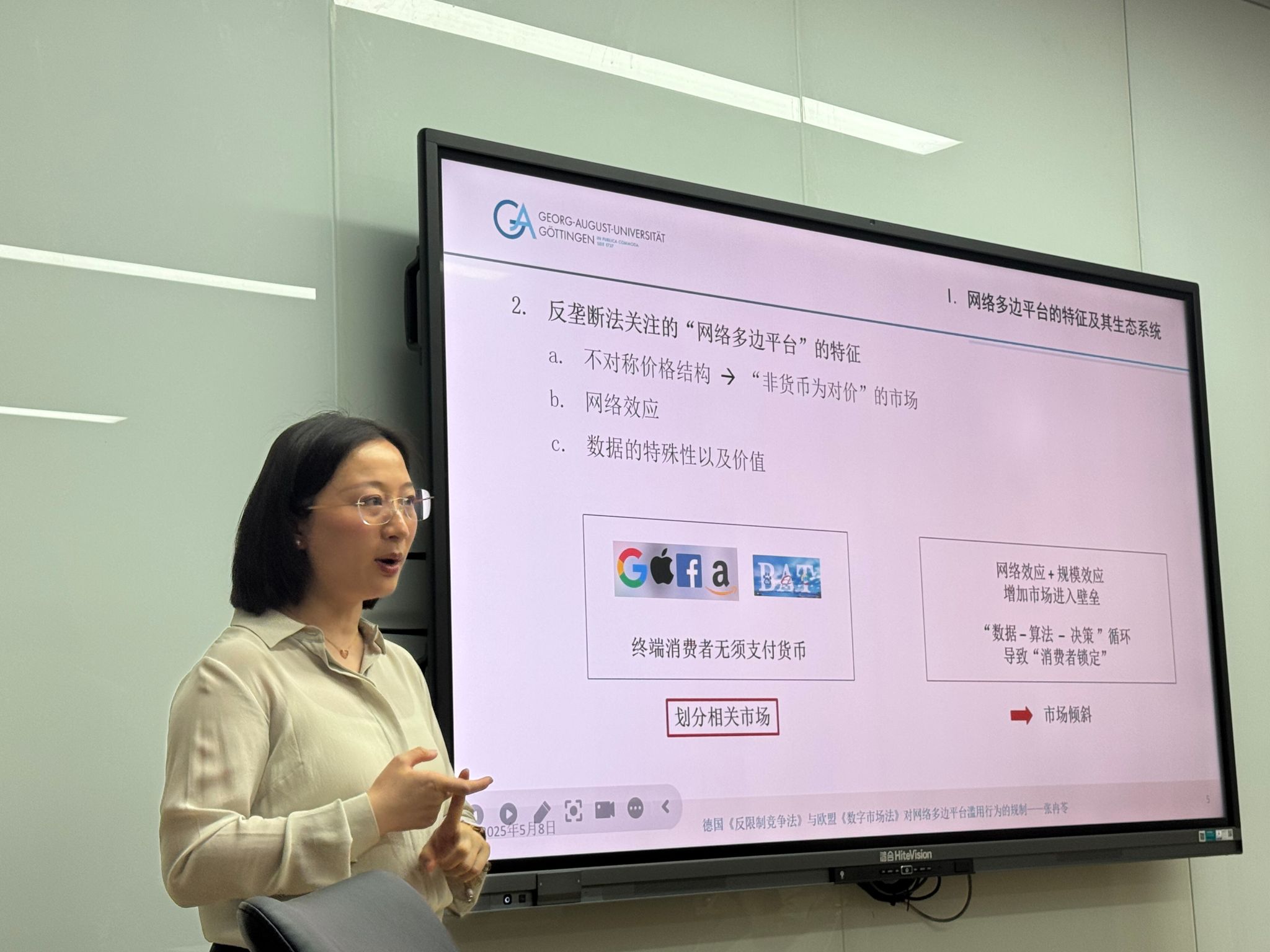 2025年5月8日,应月舞直播 中德法学研究所的邀请,德国哥廷根大学中德法学研究所科研助理张冉苓以《哥廷根大学留学经验分享”和《德国<反限制竞争法>和欧盟<数字市场法>对网络多边平台滥用行为的规制》为题,为第167期“中德法学论坛”做学术讲座。