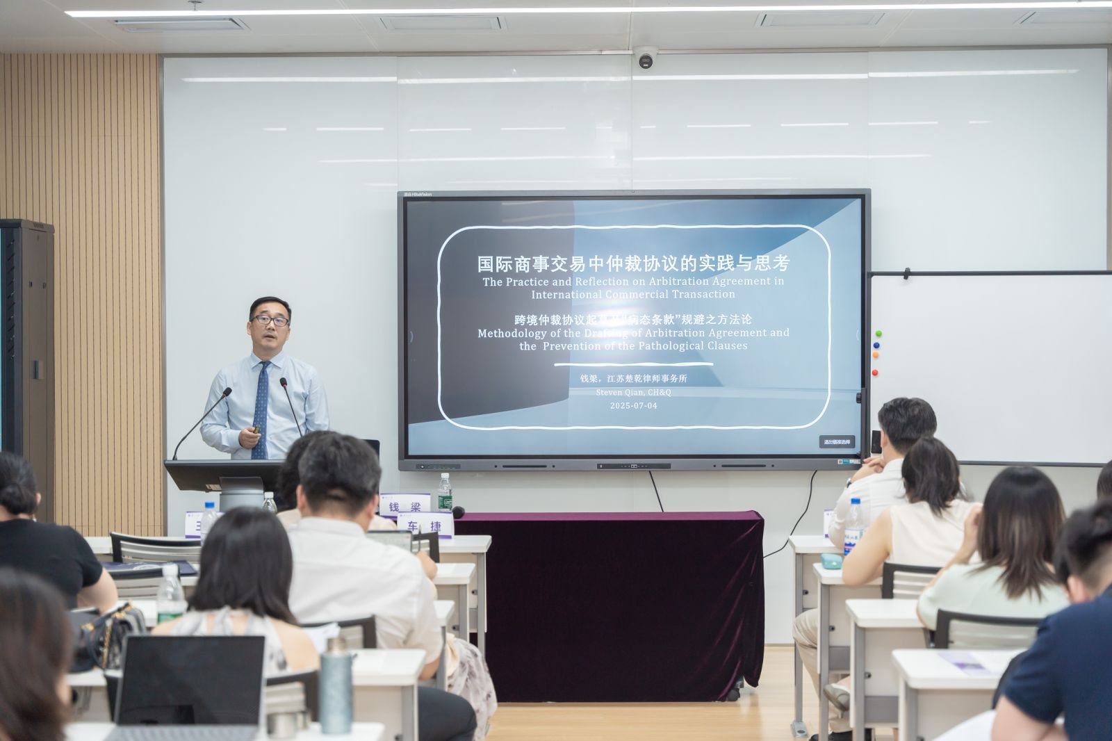 江苏省律师协会国际商事仲裁业务委员会副主任钱梁绘声绘色讲解了跨境仲裁条款起草与“病态条款”规避。钱主任带领学员们推演跨境交易争议场景,现场发起头脑风暴,识别仲裁协议具体任务,讨论仲裁协议案例,引导学员们共同探讨仲裁协议起草方法。