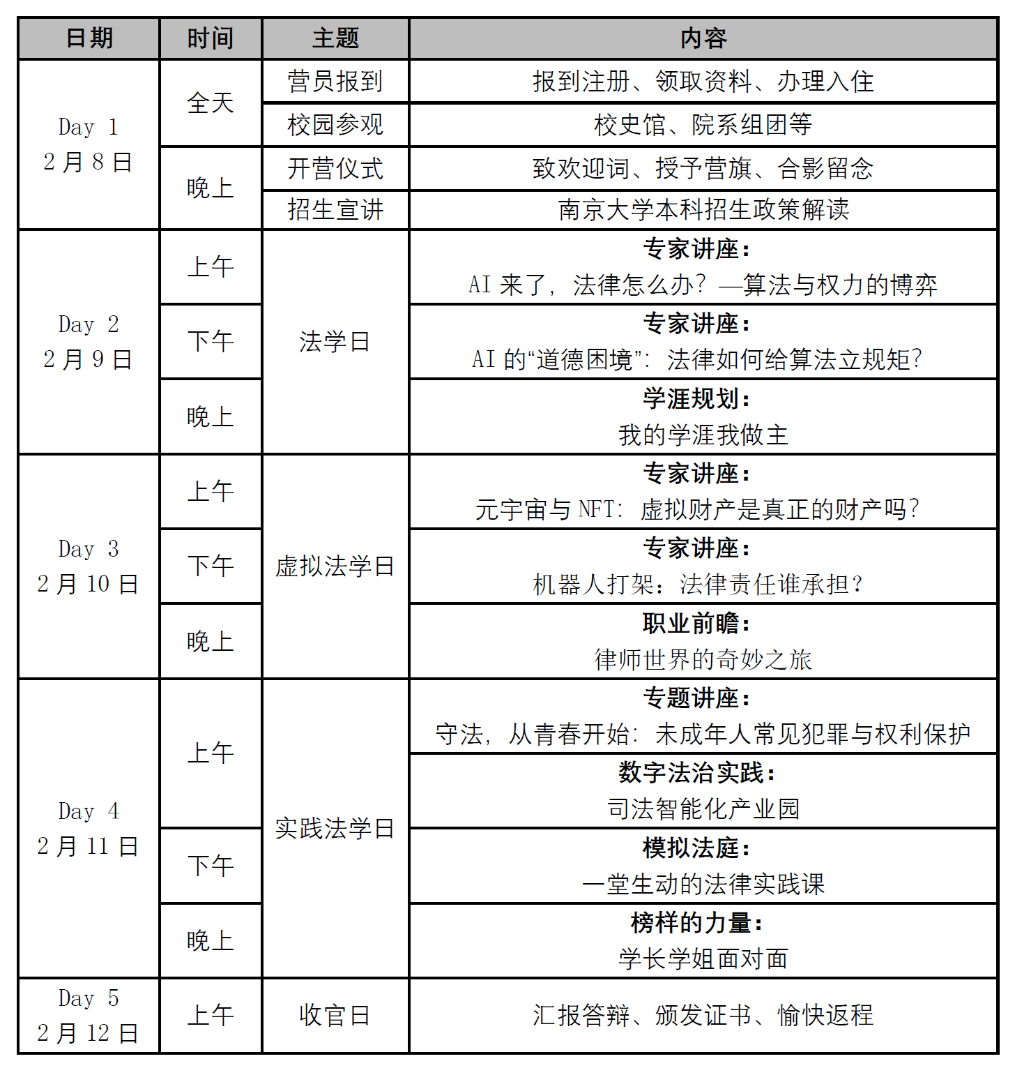 本项目旨在为全国优秀中学生打造一个融通理论与实践、注重思维启迪与价值引领的高端学术平台。通过沉浸式的课程与实践,激发学生对法律与道德问题的探究热情,培养其批判性思维、社会责任感和卓越的领导潜质,助力其未来成长为德法兼修的杰出人才。