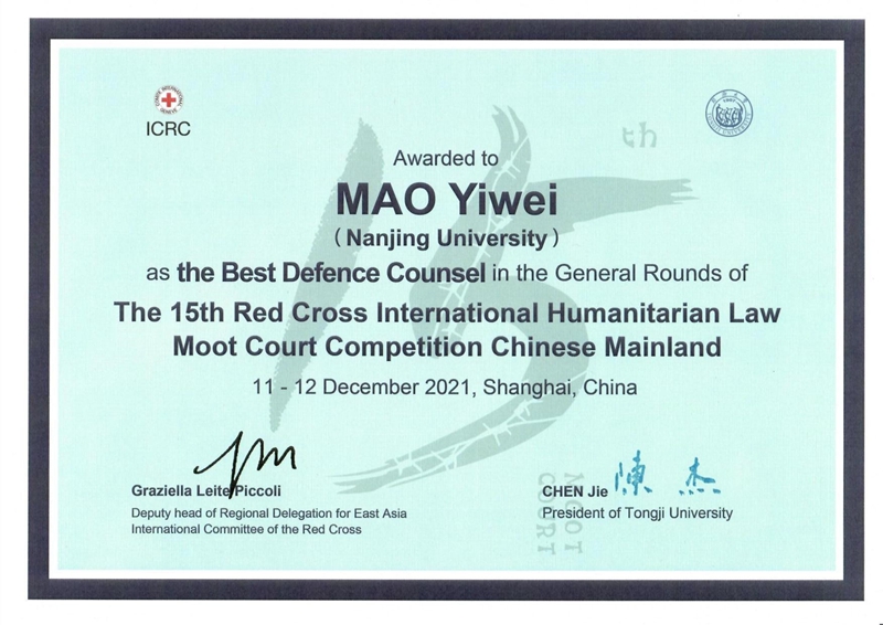 代表队最终荣获团体总分二等奖,其中毛奕帷同学在全部参赛队员中以并列排名第一的个人成绩获得初赛最佳辩护人(Defense Counsel)(个人单项冠军)。