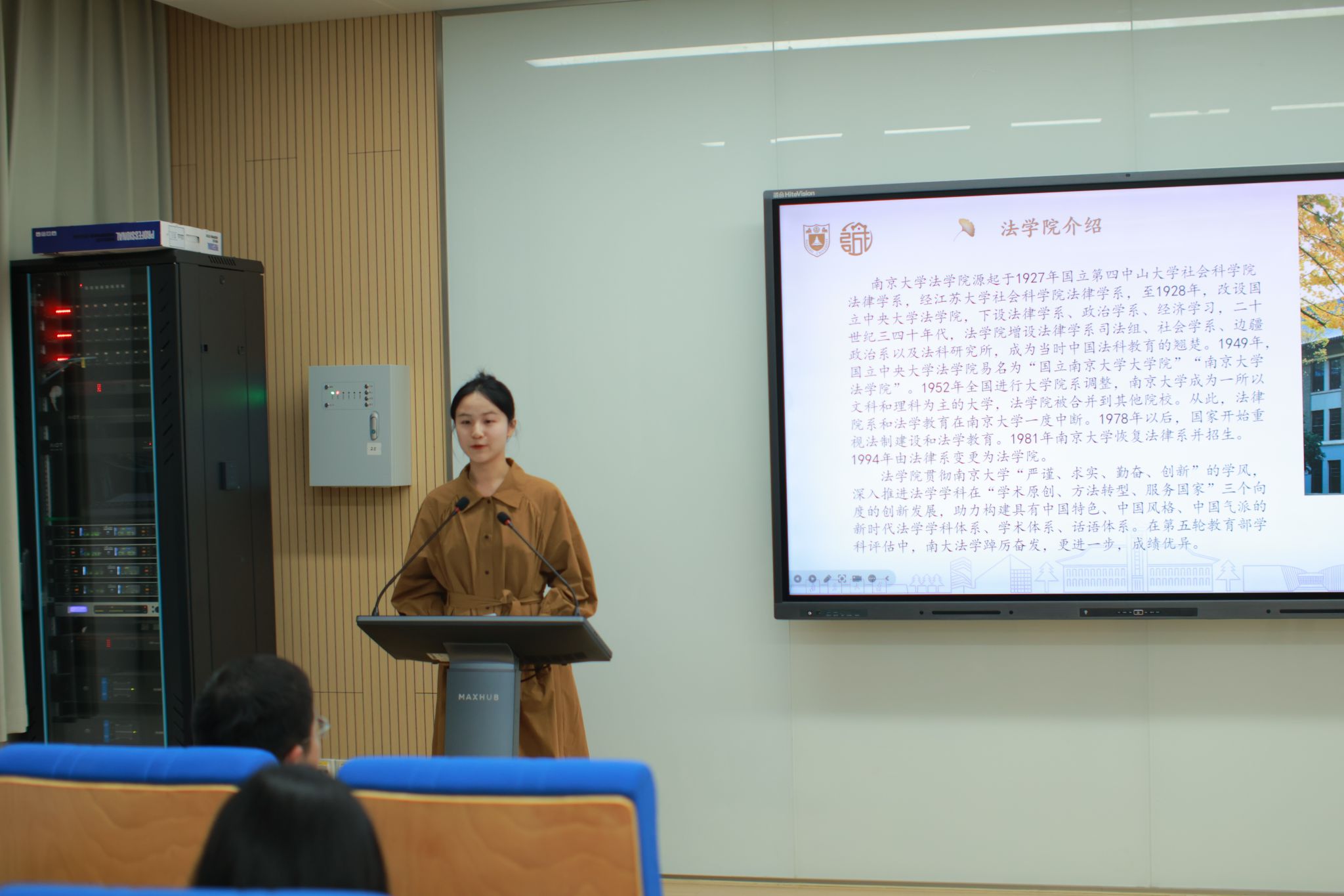 2021级本科生刘予欣作为学生代表,结合自身经历进行“三维成长攻略”主题分享。在课程学习方面,她建议新生注重法学学习的体系性与逻辑性,通过课堂笔记的高效整理、经典书目的深度研读及案例分析实践来培养法律思维;关于第二课堂,她鼓励新生结合自身兴趣,在模拟法庭等赛事中提升法律实践能力,通过法检、律所等实习积累实务经验,实现多元探索、全面成长;谈及未来规划,她结合自身保研经历,介绍了月舞直播