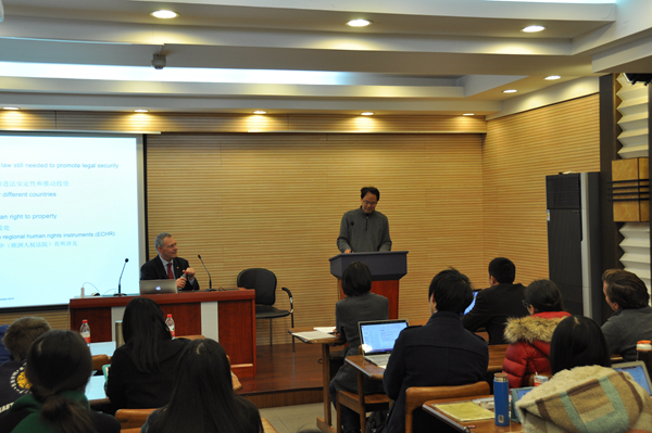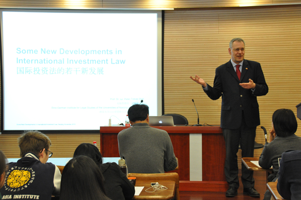 史彼得教授首先对国际投资保护的现状和演变过程进行了介绍和分析,随后又重点介绍了国际投资保护的新进展,并针对“新‘宪法性’视角”结合澳大利亚、加拿大、德国以及欧盟的案例进行了详细的梳理、分析和评论。最后,教授对国际投资法的前景发表了自己的看法。史彼得教授的报告细致科学,严谨敏锐,具有很大的思考价值和启发意义,受到师生高度评价。