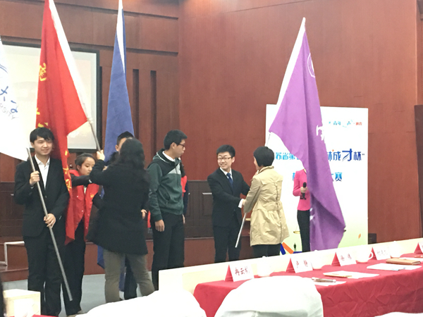 上午九点,“仙林成才杯”决赛正式开始,共青团中央权益部维权处处长冉云梅、栖霞区委常委、政法委书记孙爱军、栖霞区政法委副书记潘洪义、南京市法学会专职副会长丰友芳、栖霞区司法局局长卢静为决赛队伍授旗。
