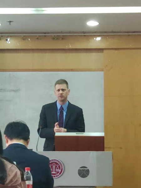 Chad Flanders教授以美国总统特朗普“建墙”为例,介绍了美国行政、立法、司法三权之间的协作、冲突和解决方案,以及美国刑事诉讼中的一般刑事审判程序、认罪程序和赦免制度等。