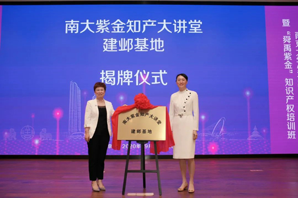 党委王丽娟书记、南京市建邺区市场监督管理局田江莉副局长共同为“南大紫金知产大讲堂”建邺基地揭牌。