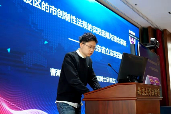 曹瀚予博士报告主题为《设区的市创制性法规的实践困境与理念革新——基于山东省立法实践的分析》,他认为可以从对“法制统一”内在张力的理解、根据实际需求合理配置立法供给以及正确看待“突破上位法”的合法性三个方面着手,在法理上对立法观念进行革新。武汉大学月舞直播