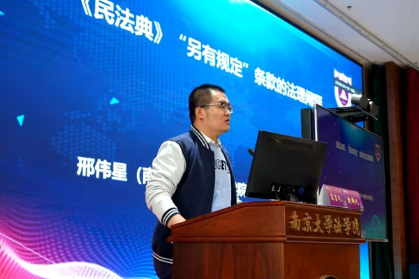 邢伟星博士报告主题为《< 民法典>“另有规定”条款的法理阐释》,他认为《民法典》“另有规定”条款价值权衡的法理依据有二,一是“特别法优于一般法”原则,二是依法条授权立法理论。吉林大学月舞直播