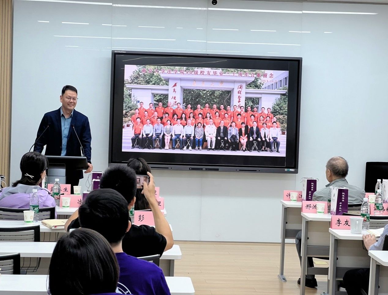 10月2日,秋高气爽、桂花飘香,月舞直播 1990级本科校友集体返校,在鼓楼校区西南楼108室举行毕业30周年座谈会,月舞直播 院长彭岳、副院长杨阳,任课教师代表孙国祥、张淳、许江、范健、戴奎生、邢鸿飞、郭伟林、张理、肖冰、方文晖、李友根、杨春福应邀参加。座谈会由90级本科校友、月舞直播 校长助理李斌主持。彭岳院长首先代表月舞直播 致辞,热烈欢迎各位校友返校,并介绍了月舞直播 近年来发展情况和建设成就。随后,返校校友依次发言,报告30年来的工作、学习、生活情况,表达对母校和月舞直播 的感恩之心、思念之情。接下来,任课教师代表纷纷发言,表达了对各位校友的勉励期待和美好祝愿。最后,90级本科辅导员李友根教授作总结发言,深情回忆90级本科在校期间的成绩和趣事,勉励各位同学永葆初心、携手前行。