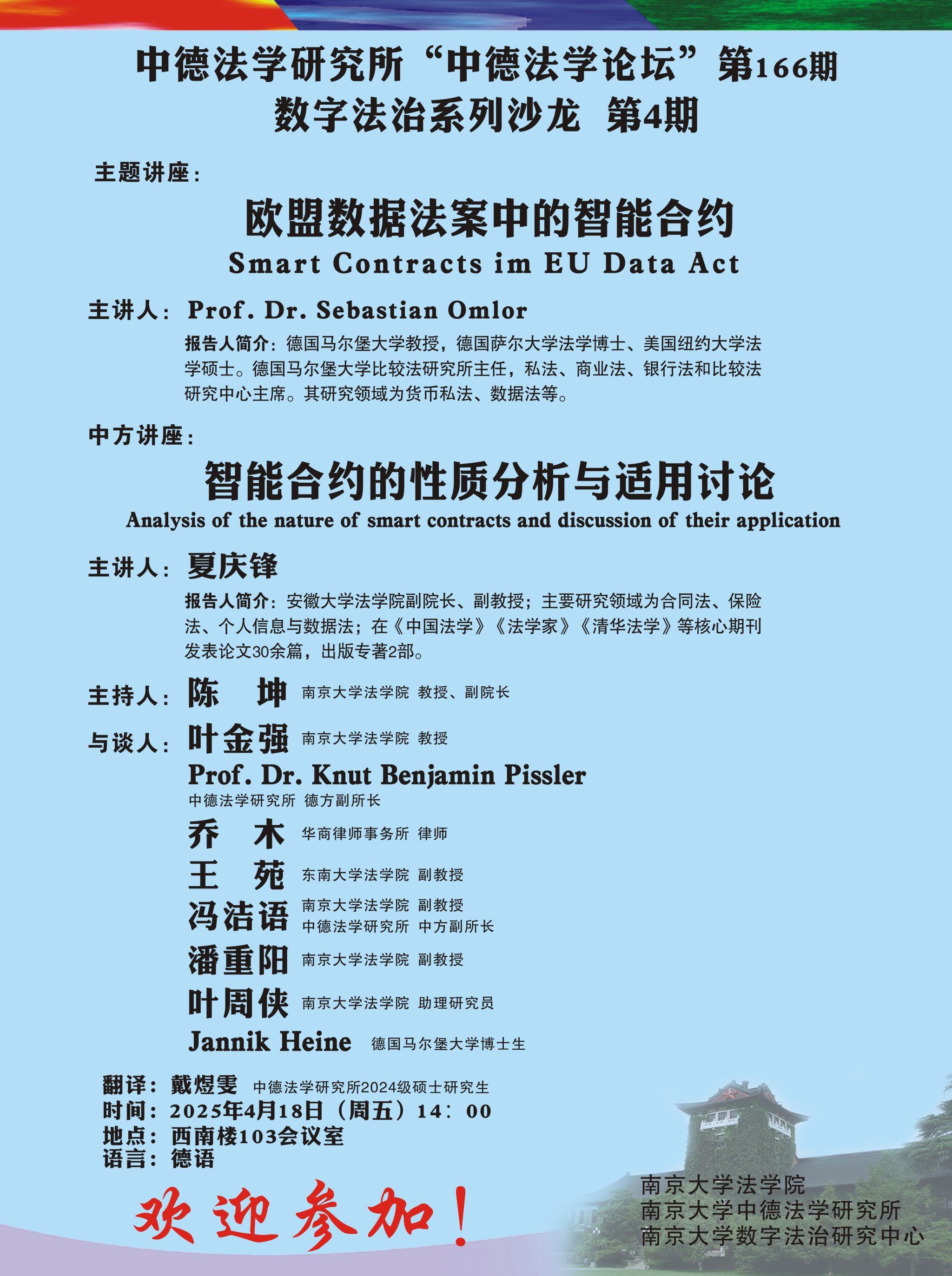 数字法治研究中心的邀请,德国马尔堡大学Sebastian Omlor教授以《欧盟数据法案中的智能合约》为题,安徽大学月舞直播