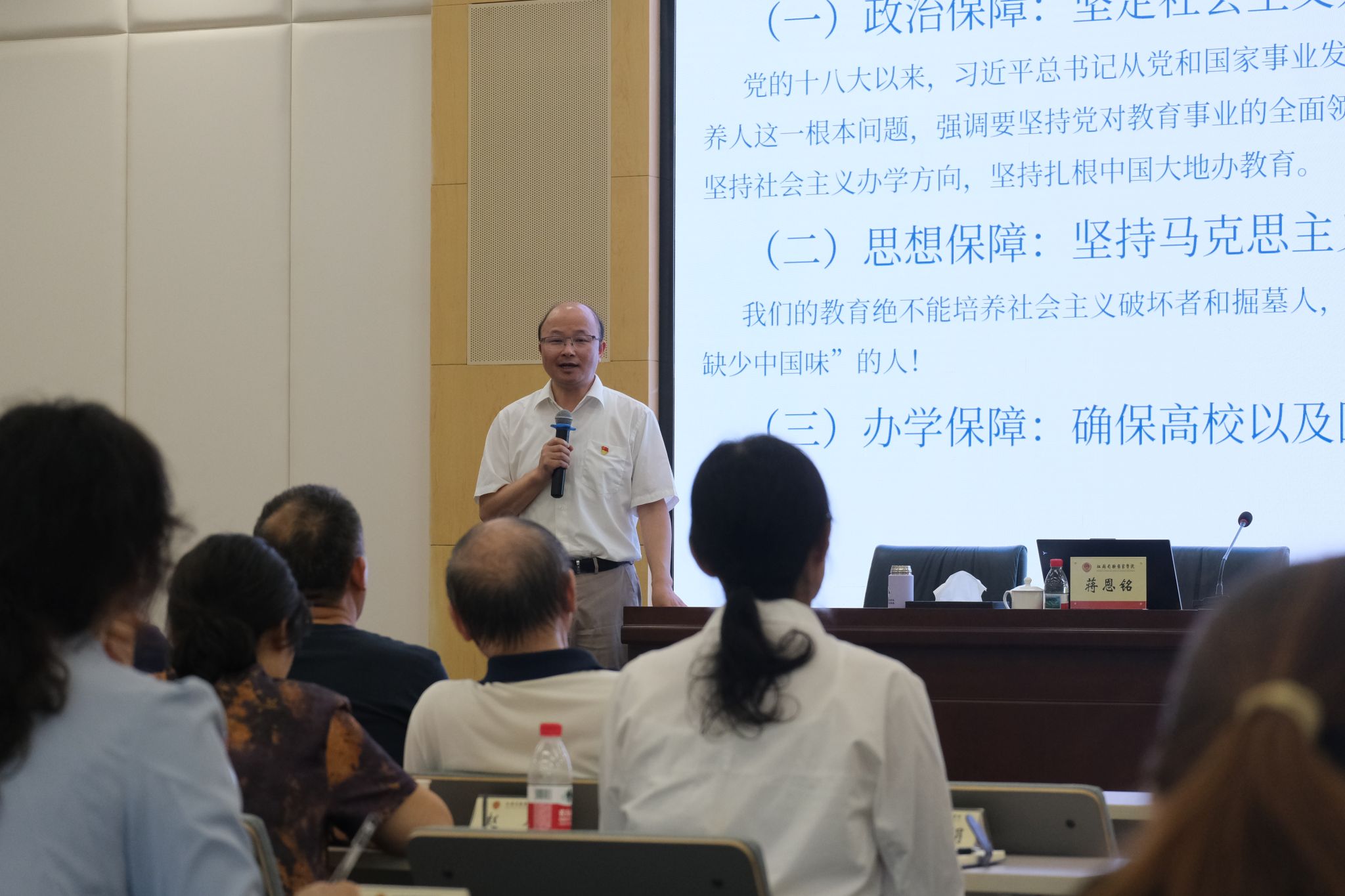 开班仪式后,蒋恩铭以“强化责任担当 筑牢意识形态安全工作防线”为题,为学员讲授党课。通过案例分析,蒋恩铭指出意识形态是一个相对抽象和复杂的概念,在实际工作中要准确理解其性质、内涵和功能。意识形态是指一种基于特定观念、信仰和价值观的社会思想体系。这种思想体系通常用于解释世界、指导行为,并为社会成员提供一套共同的价值标准和行为规范。因此,意识形态与每一个人的工作、学习和生活密切相关。师生党员应发挥模范带头作用,不断强化责任意识,守土有责,持续提升政治判断力、政治领悟力、政治执行力,坚持社会主义办学方向,筑牢意识形态安全防线,共同维护校园安全稳定。