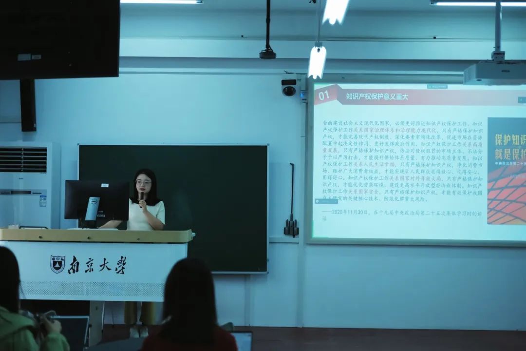 志愿者杨康宁带领同学们学习了习近平总书记关于知识产权工作的重要论述,崔越、姬彧两位志愿者则分别就著作权法与专利法的基本知识进行分享,并就相关专业实践中可能遇到的问题作出解答。