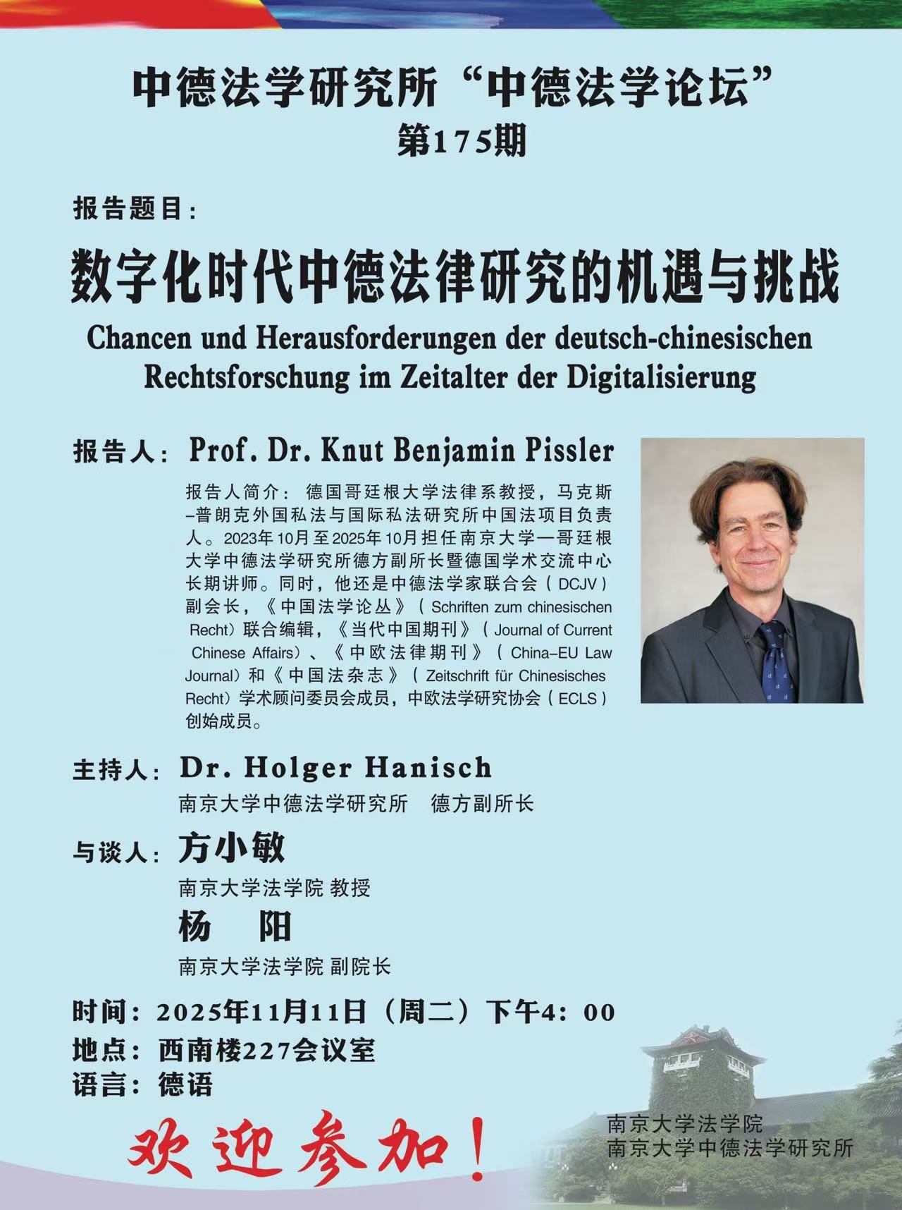 中德法学研究所邀请,德国哥廷根大学法律系教授、马克斯-普朗克外国私法与国际私法研究所中国法项目负责人Knut Benjamin Pissler以《数字化时代中德法律研究的机遇与挑战》为题,为第175期“中德法学论坛”做学术讲座。