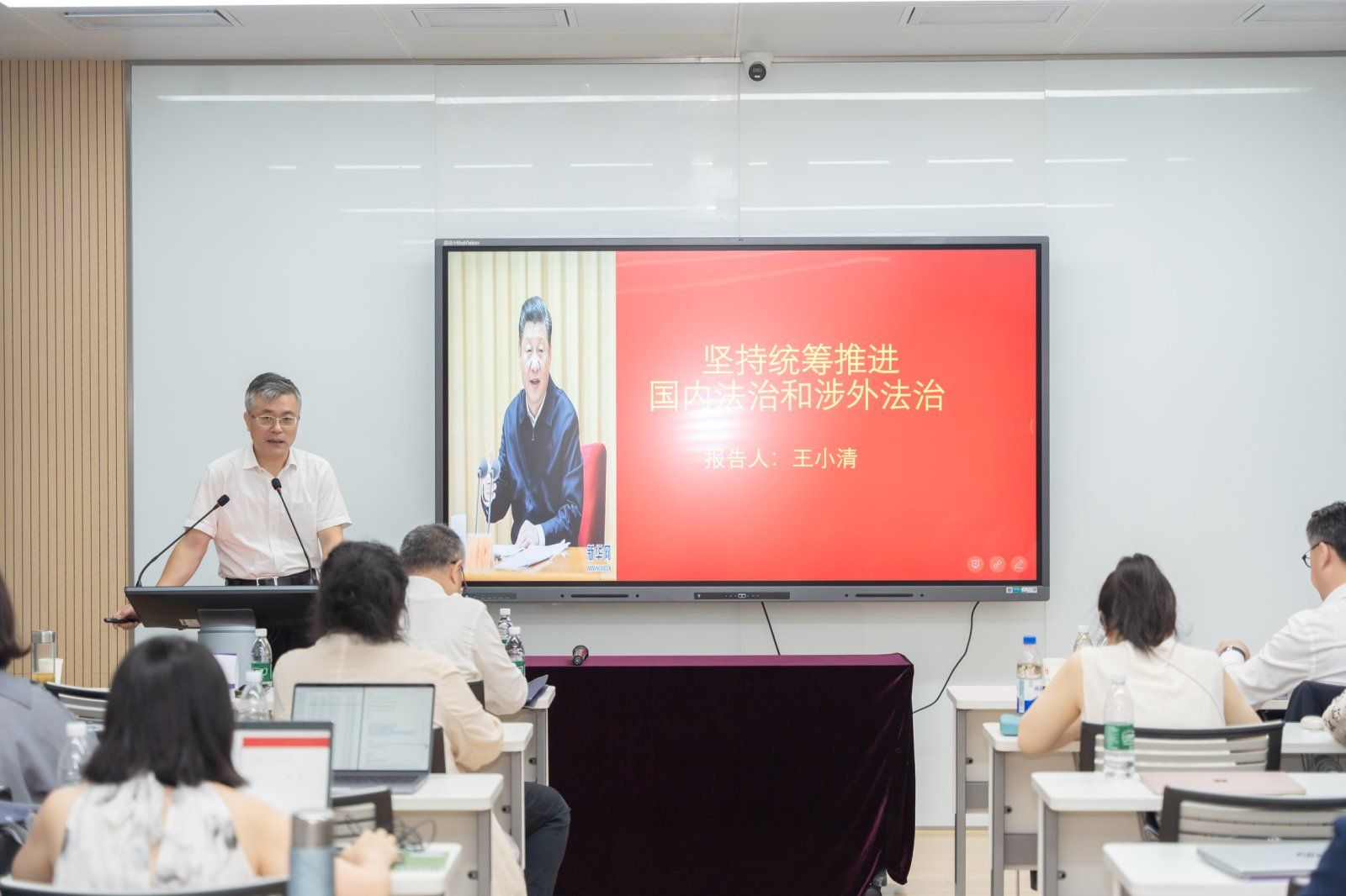 江苏省律师协会副会长王小清宣讲习近平涉外法治思想,号召全体法律界人士坚持以习近平新时代中国特色社会主义思想为指导,深入学习贯彻习近平法治思想,紧跟时代要求和人民意愿,遵循法治规律、坚持系统观念,以涉外法治体系和能力建设为着力点推进涉外法治工作,不断提高涉外工作法治化水平。